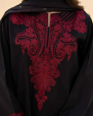 Additional Description: Step into timeless elegance with our “Noir Rouge Charm” 3-piece linen suit, a graceful blend of bold sophistication and delicate charm. The black linen shirt features intricate maroon embroidery on the neckline, sleeves, and hem, offering a striking contrast that captures attention effortlessly. Paired with matching black trousers adorned with embroidered borders, the outfit reflects understated luxury.