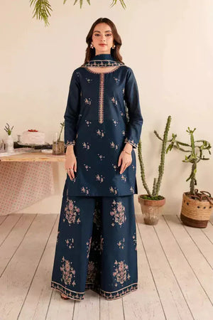 Get festive-ready with the Albus Percival 3pc Dress. Made from Premium Cotton in Aegean blue, this outfit features a short length shirt with embroidered details and a net dupatta with organza borders. The fully embroidered cambric sharara completes the look. Perfect for any occasion, embrace the season in style.