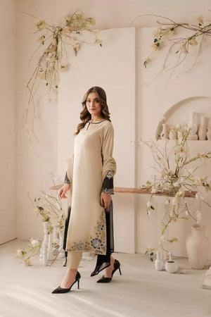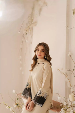 The beige kurta and trouser exude understated charm, while the beige and black dupatta adds a striking contrast, making it perfect for both festive celebrations and formal gatherings. Each piece is meticulously handcrafted by skilled artisans, taking an entire day to create a masterpiece that embodies elegance and tradition.
