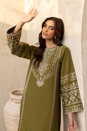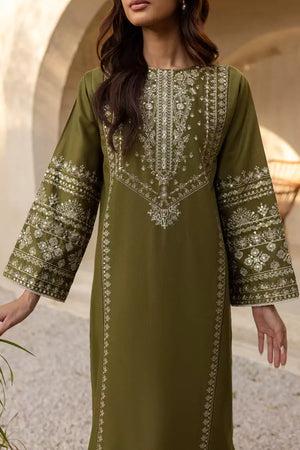 Make a statement with the Odin 2-piece outfit, crafted in moss green cotton for a luxurious yet breathable feel. The heavily embroidered shirt features a composed neckline in contrasting threads, enriched with delicate sequins for a subtle shimmer. Bold geometric embroidery on the sleeves adds an artistic touch, making this outfit a true standout.