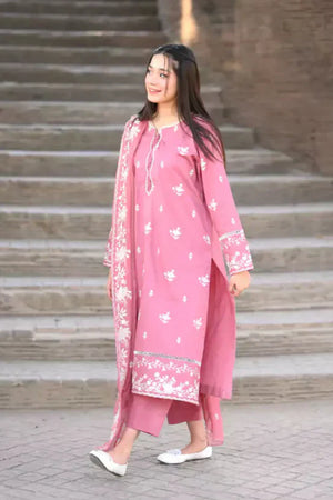 Embrace effortless elegance with the Blush Embroidered Cotton Set, a timeless ensemble crafted for the modern woman. The embroidered shirt features delicate lace detailing on the sleeves and daman, while the lace and loop accents on the neckline add a refined touch. Paired with a comfortable cotton trouser and an embroidered chiffon dupatta, this stitched set is perfect for festive gatherings, formal occasions, and everyday sophistication.