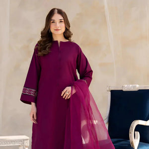 Elevate your ethnic wardrobe with our Dark Purple 3-Piece Set. The intricately embroidered sleeves and Organza Dupatta add a touch of elegance, while the loops on the neckline and straight Cotton Suit ensure comfort and effortless style. Available in sizes S-XL.