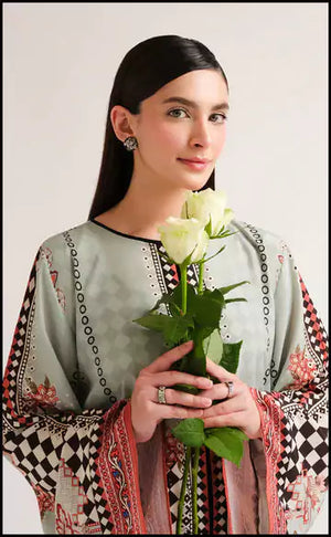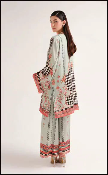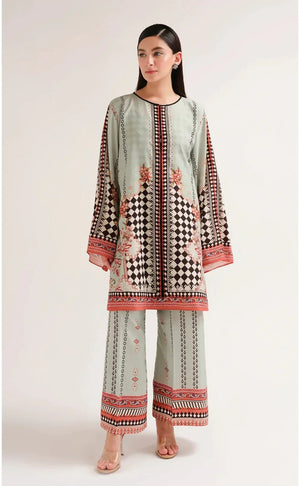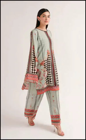 A captivating fusion of modern geometry and delicate florals, this 2-Piece Stitched Set is designed for effortless elegance. Featuring: