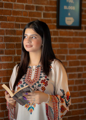 Additional Description: 🌸 MEERAB – Poly Lawn Cord Set 🌿 Celebrate tradition with a modern twist in our Meerab Poly Lawn Cord Set, a vibrant fusion of ethnic charm and contemporary style. The soft cream-toned shirt is adorned with intricate multicolored embroidery, highlighting tribal and floral motifs in rich hues of rust, maroon, green, and teal. The detailed borders on the sleeves and hem add depth and character, enhanced by playful tassel finishes. Paired effortlessly with boldly printed culottes, featuring an eclectic mix of geometric and ethnic patterns in earthy shades, this outfit radiates festive freshness. Whether it’s a casual day out or a cultural event, Meerab ensures you turn heads with grace. Fabric: Premium Poly Lawn Type: Stitched Cord Set (2PC) Shirt: Embroidered front with printed side panels & borders Trousers: Printed culottes with intricate geometric & floral design Style: Ethnic fusion – chic, breezy & effortless