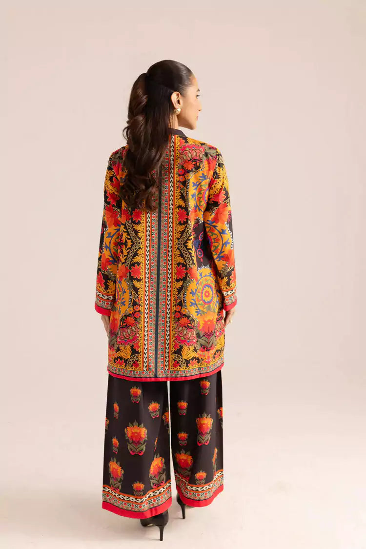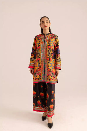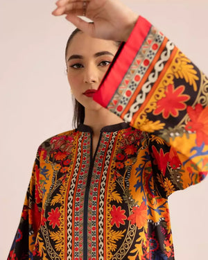 • 2-Piece Stitched suit in luxurious digital printed silk, featuring vibrant floral motifs.